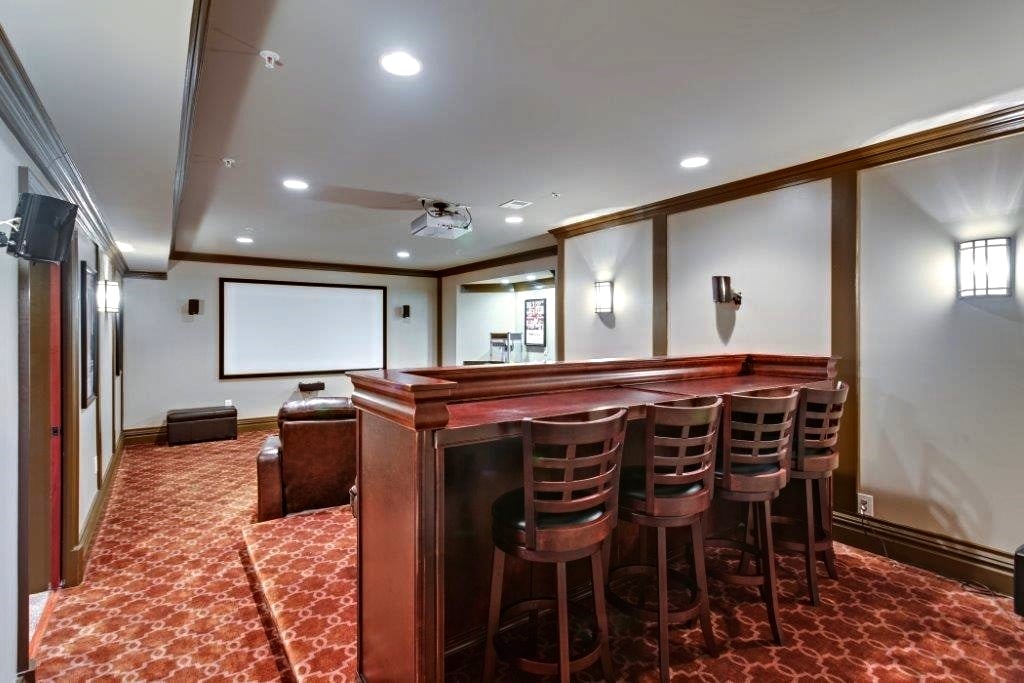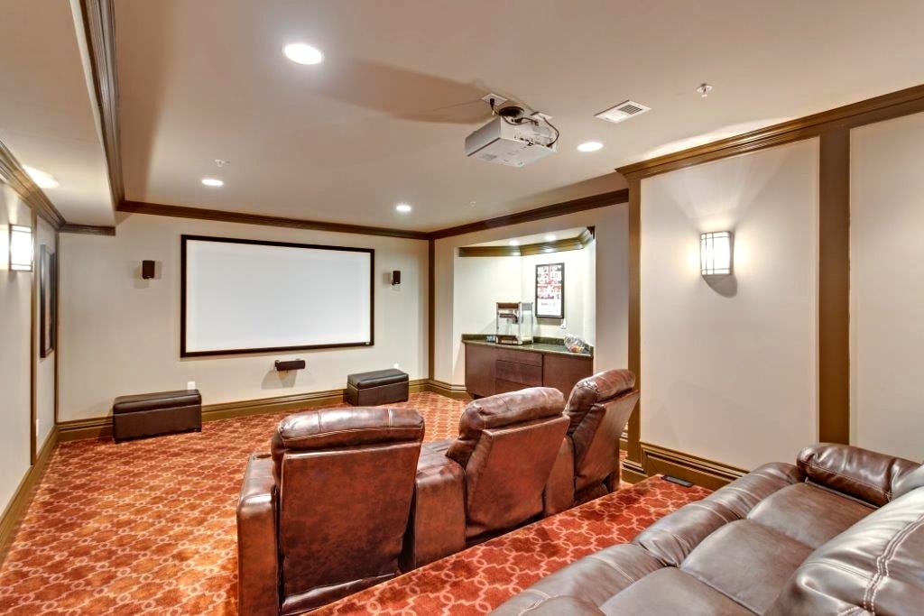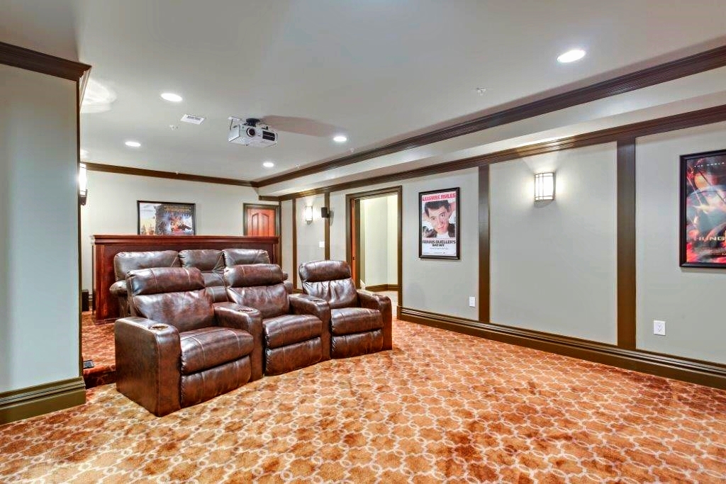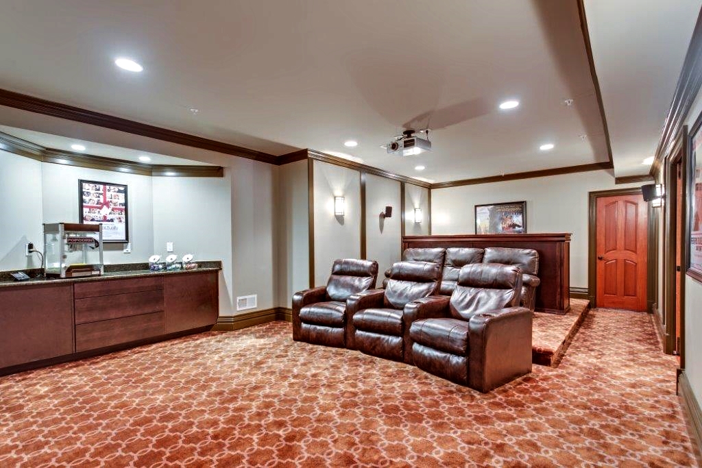 When you have an empty room and nothing to put in it, thinking outside of the box for an interior remodel can really pay off like it did for these Bethesda homeowners. This media and entertainment room is more of a private home theater, complete with a powerful projector, surround sound, bar seating, and six leather lounge chairs complete with cup holders. For that personal touch, movie posters (Ferris Bueller's Day Off was an obvious choice) hang between sconce lights and wood trim panels. Integrated ceiling lights are dimmable, of course.